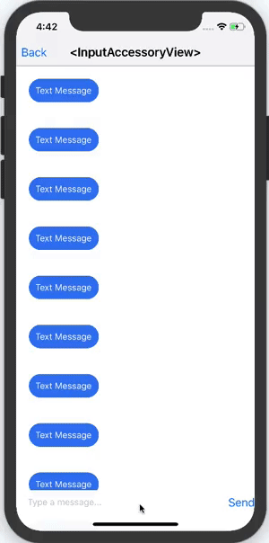 Here, the text input is actually part of the input accessory view itself. This is commonly used in messaging applications, where a message can be composed while scrolling through a thread of previous messages.